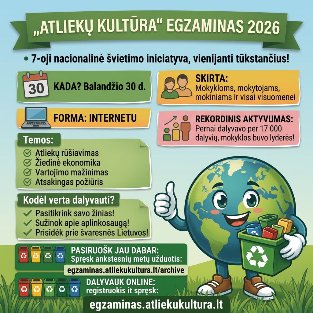 Gimnazijos bendruomenės dėmesiui – kviečiame dalyvauti „Atliekų kultūros“ egzamine 2026. Kviečiame mokinius, mokytojus ir visą gimnazijos bendruomenę dalyvauti jau septintus metus organizuojamame „Atliekų kultūros“ egzamine. Tai puiki galimybė pasitikrinti žinias apie atliekų rūšiavimą, tvarumą bei aplinkosaugą. Egzamino data: 2026 m. balandžio 30 d. Laikas: nuo 9.00 iki 20.00 val. Dalyvavimas: internetu, svetainėje – egzaminas.atliekukultura.lt Norint dalyvauti egzamine, būtina iš anksto užsiregistruoti ir susikurti asmeninę paskyrą. Joje dalyviai galės peržiūrėti savo rezultatus ir atsisiųsti diplomą. Pasiruošti egzaminui galima: